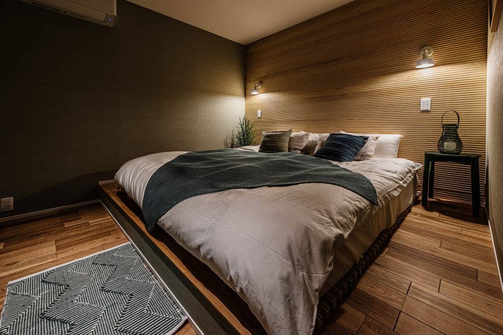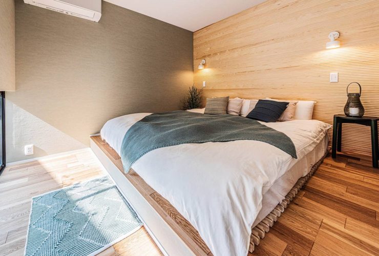 無垢材を一面に使用した木の香りが満ちる寝室。