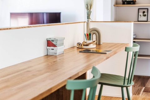 対面式のスタディコーナー。3m 以上あるので、パパママの書斎や在宅ワークにも活用いただけます。