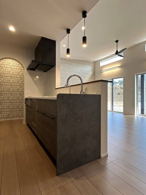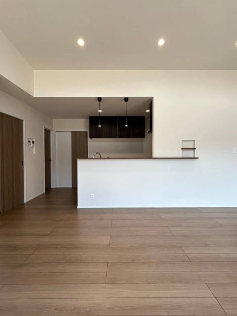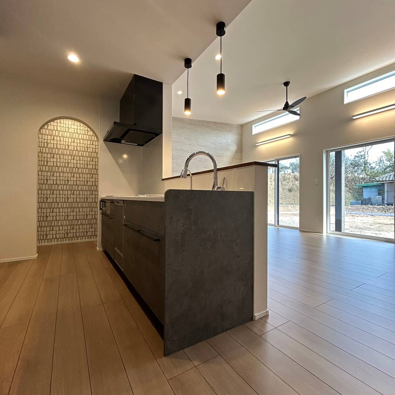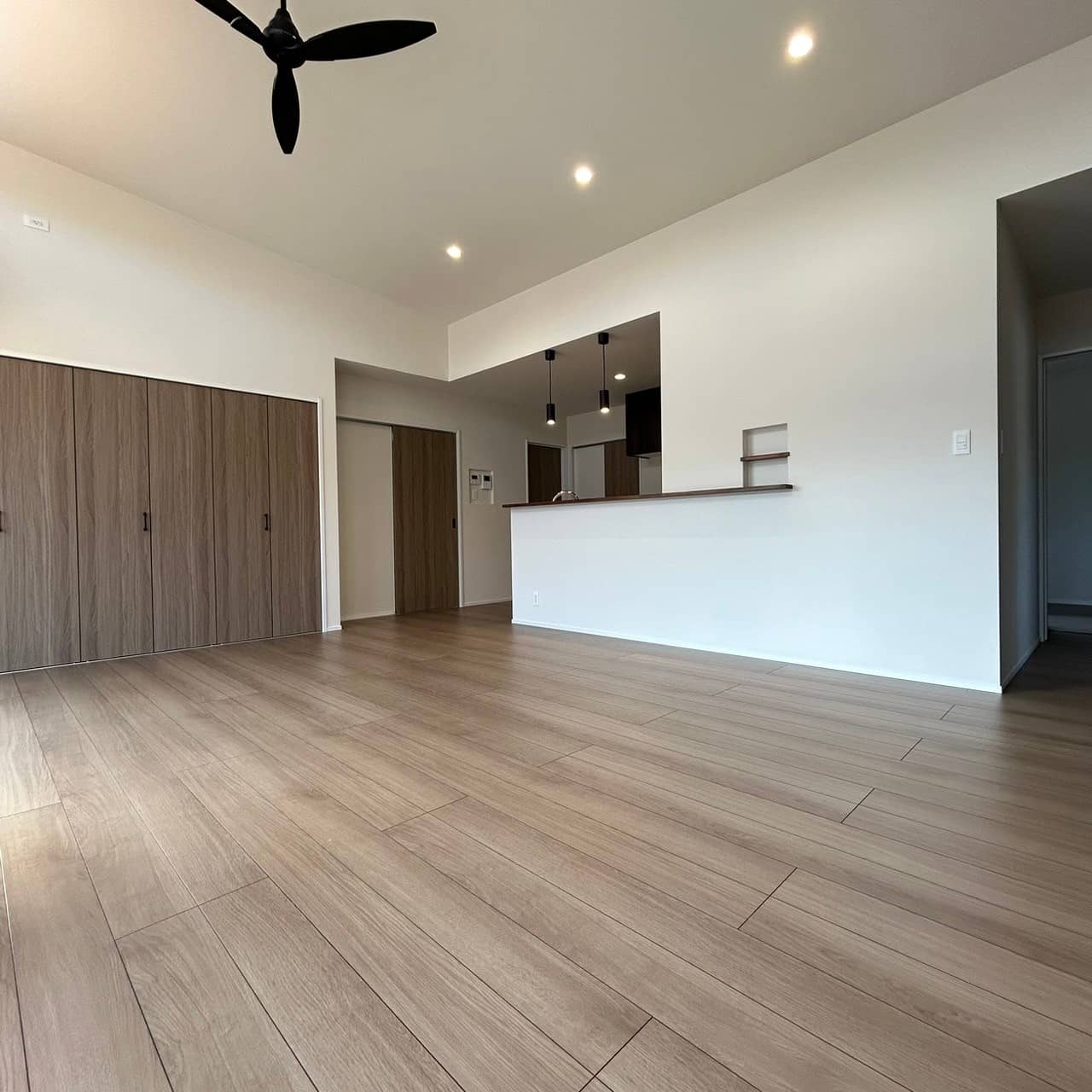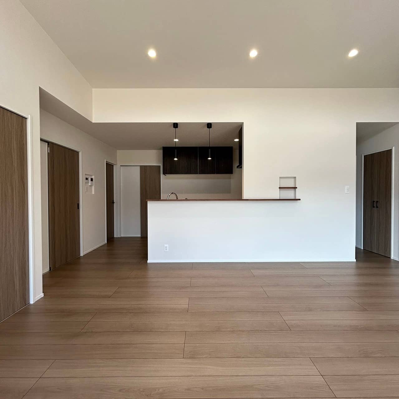 ーシンプルモダンな平屋の家ー 広々としたリビングや勾配天井が特徴的な平屋のお家 動線のとれた暮らしやすい間取りです 木目とモノトーンの配色がモダンな空間を演出しています