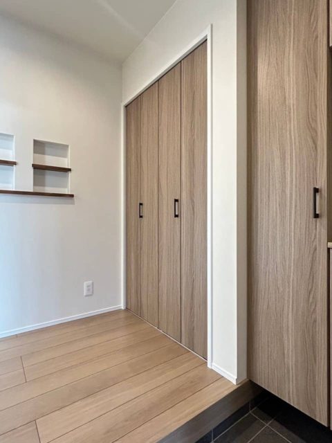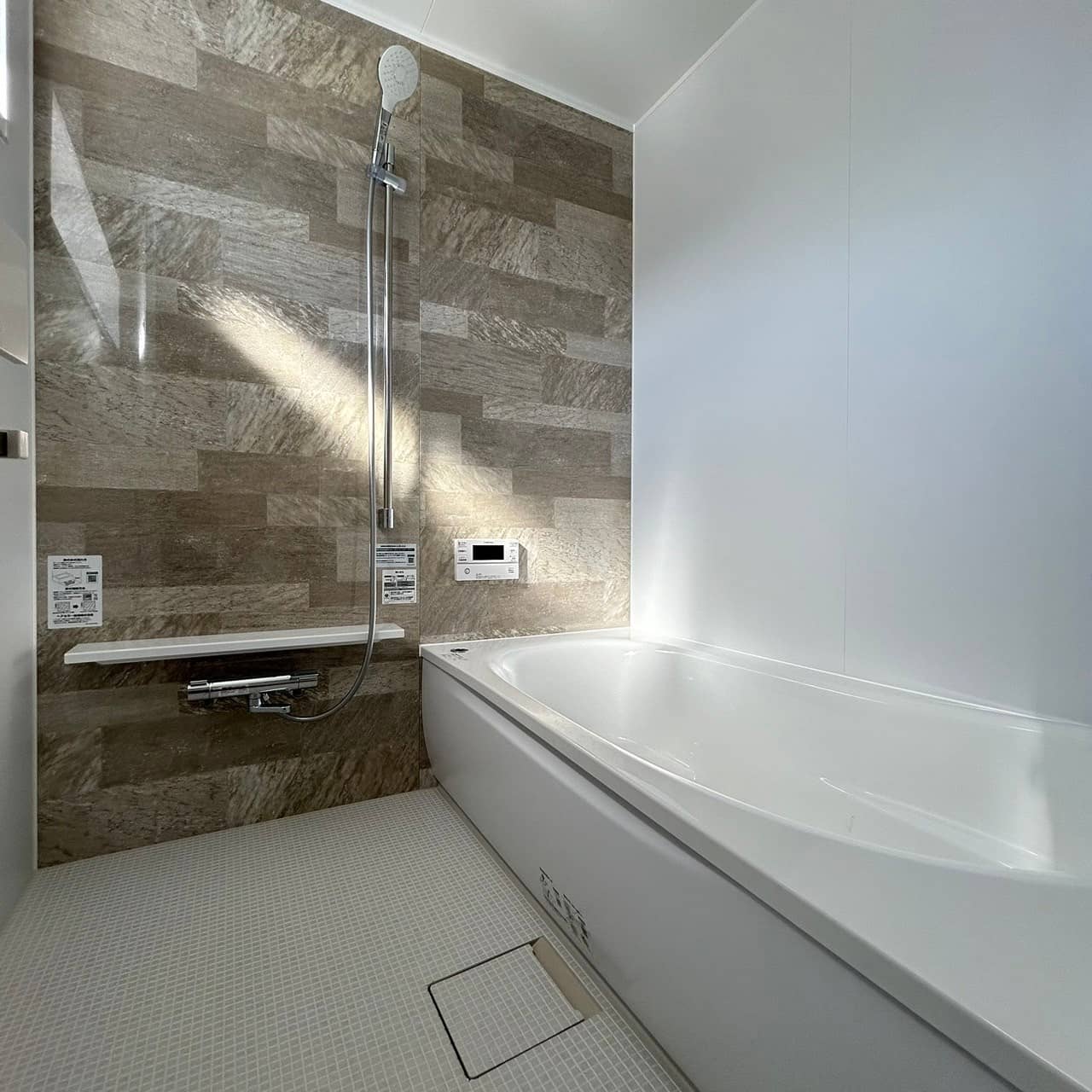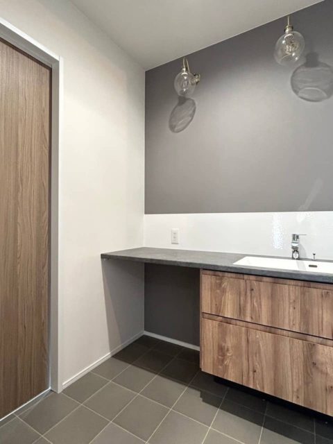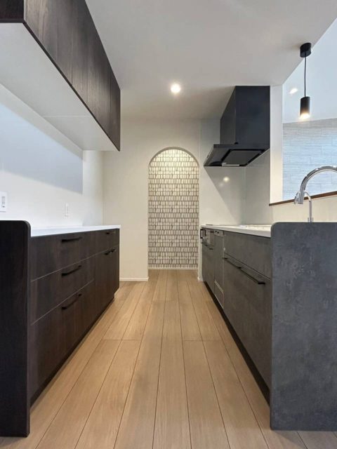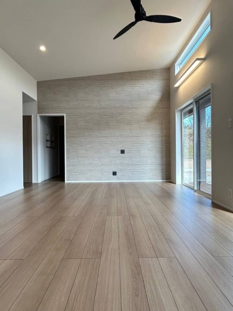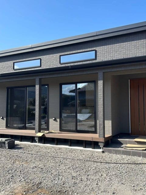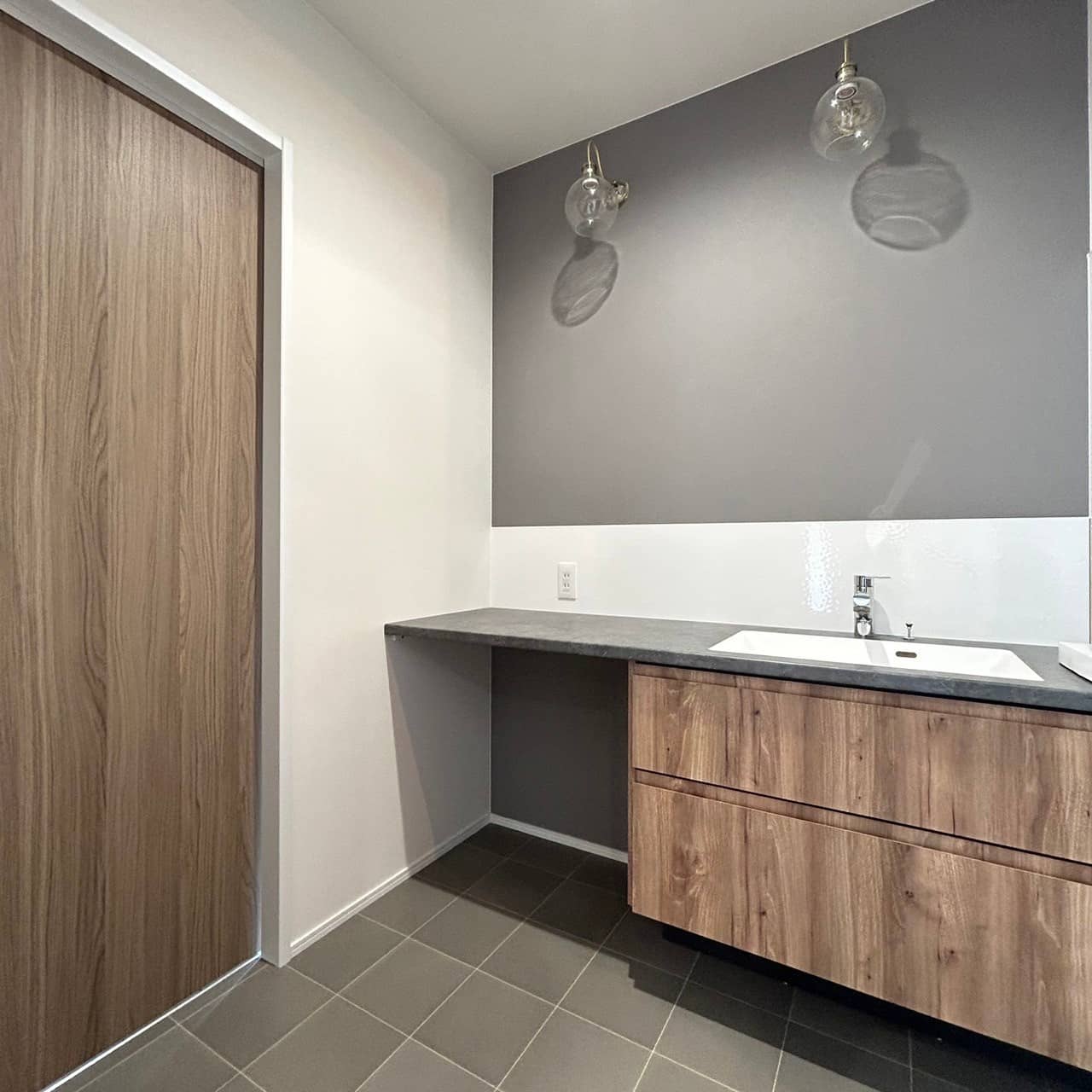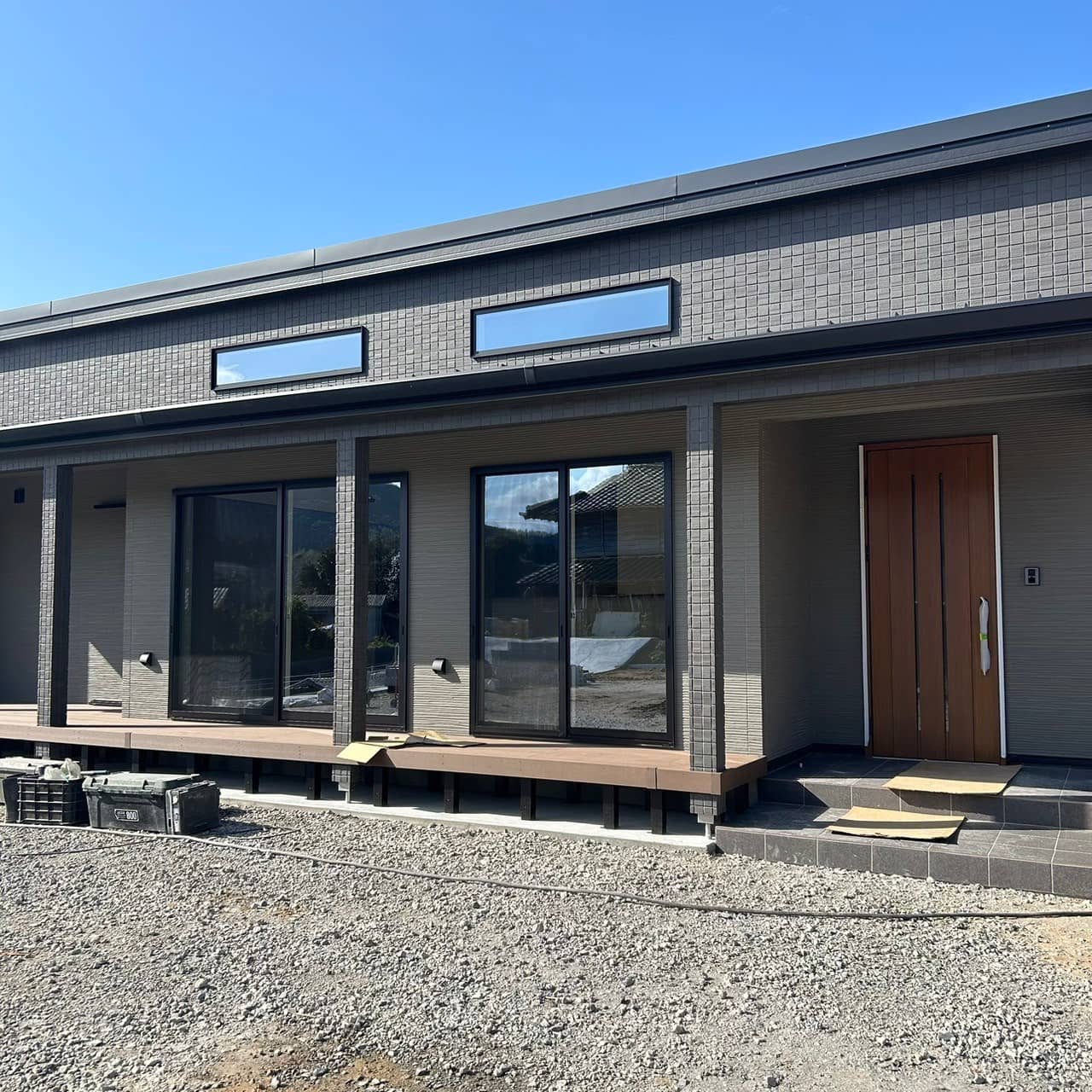 ーシンプルモダンな平屋の家ー 広々としたリビングや勾配天井が特徴的な平屋のお家 動線のとれた暮らしやすい間取りです 木目とモノトーンの配色がモダンな空間を演出しています