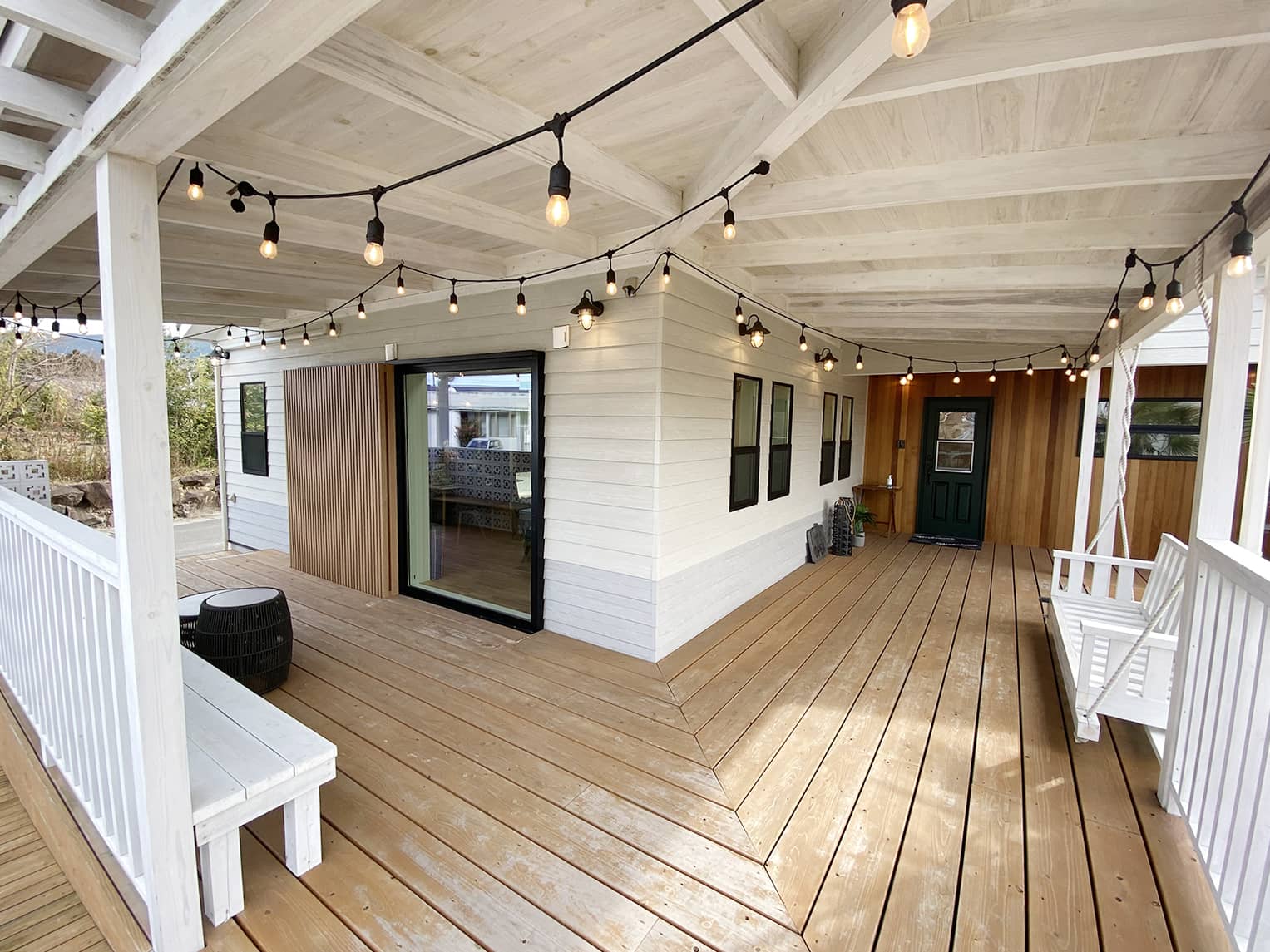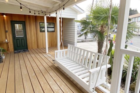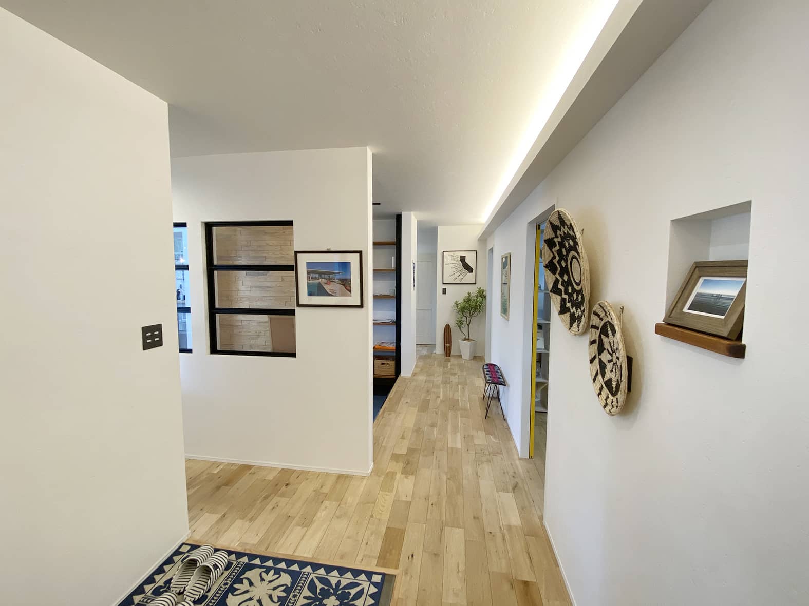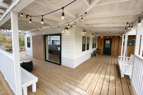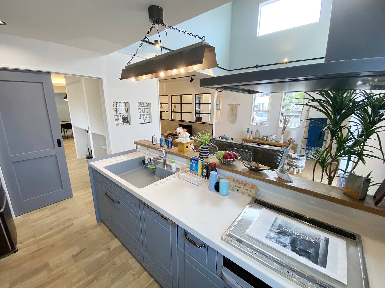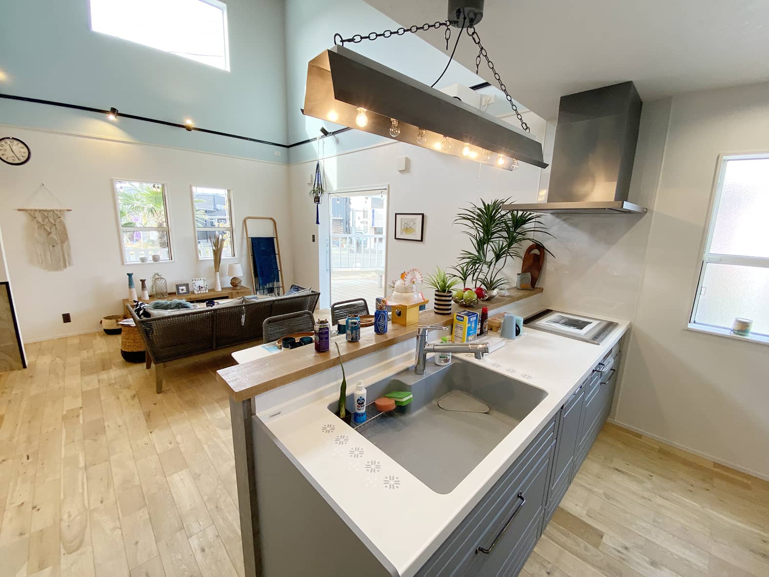 カリフォルニアスタイルのモデルハウス 。広々としたカバードポーチが印象的な外観。リビングは小下がりのスペースもありゾーンごとに多目的に利用できます。 モデルはいつでも見学できますのでお気軽にお問い合わせください。