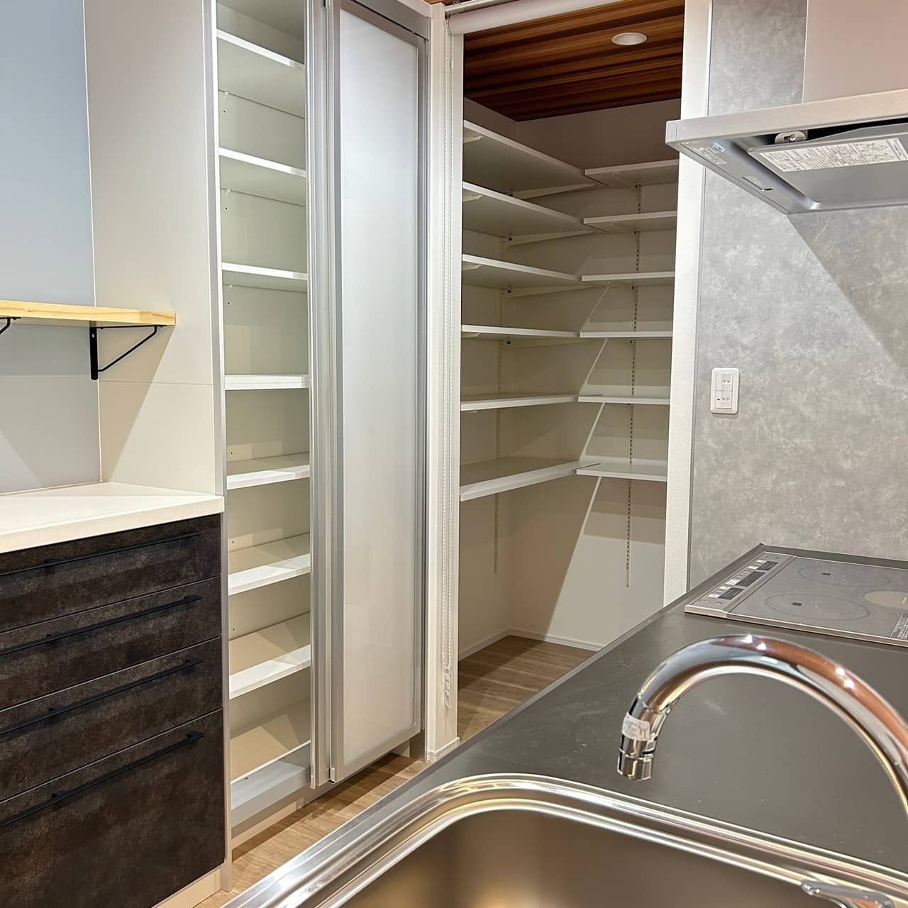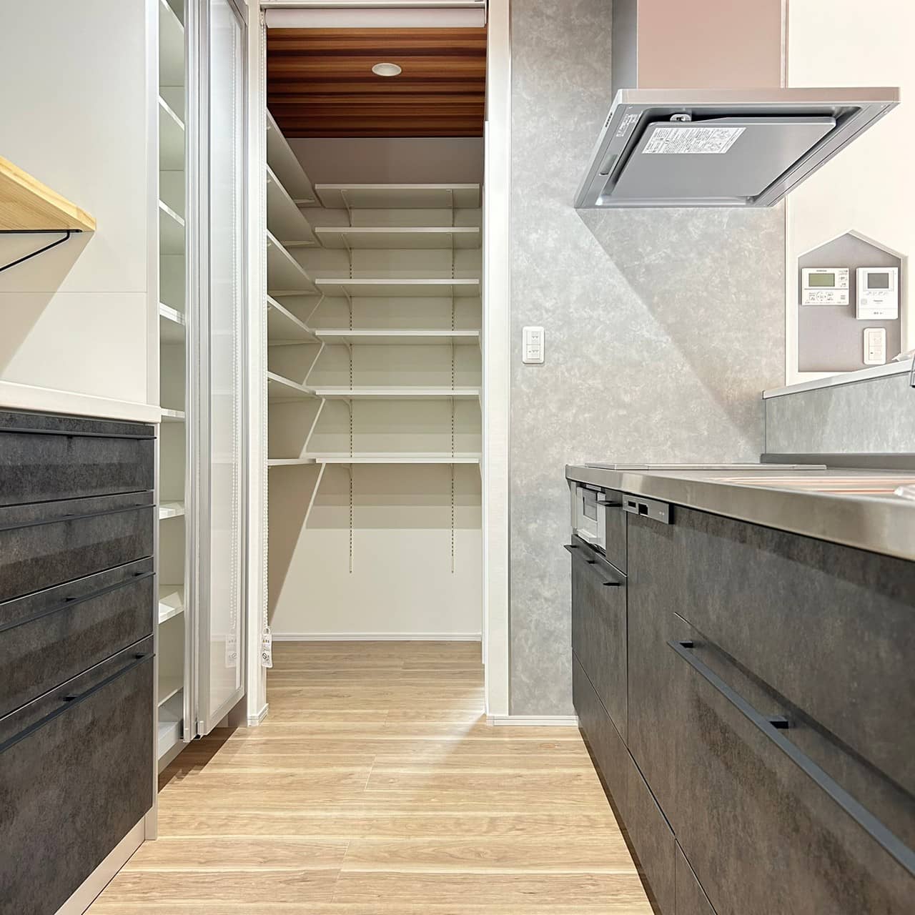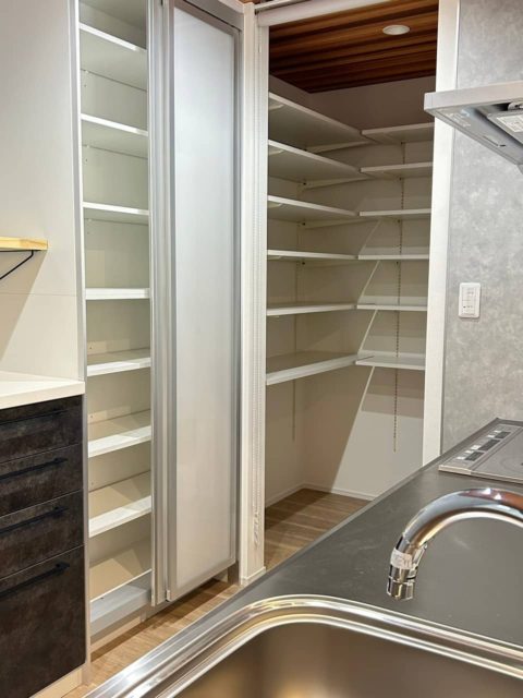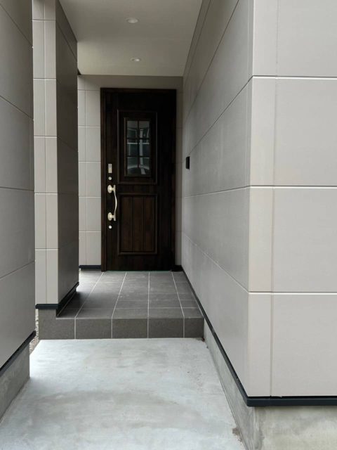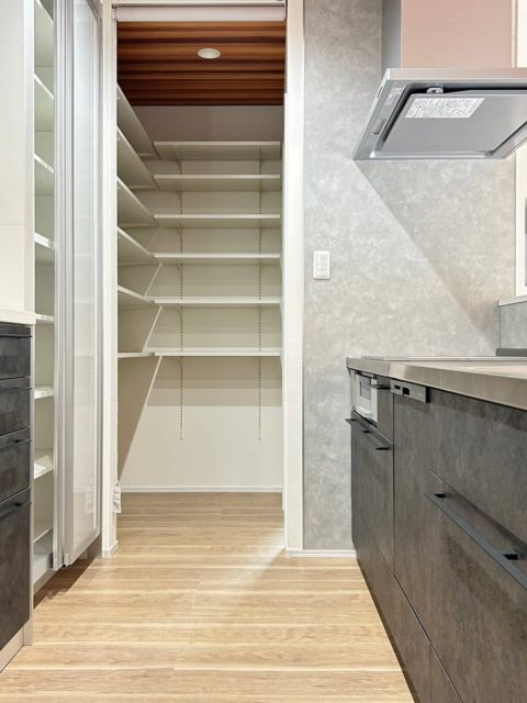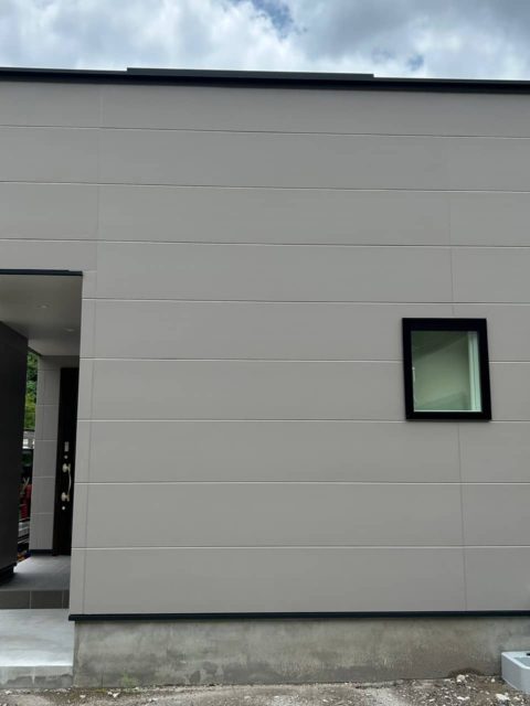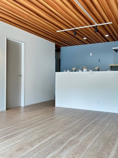グレーの外観が印象的なモダンな平屋建てが完成しました。各スペースにはアクセントクロスを用いており個性の光る空間になりました。収納の多い対面キッチンはリビングを見渡せるので家族のコミュニケーションがいちだんとスムーズにとることができます。