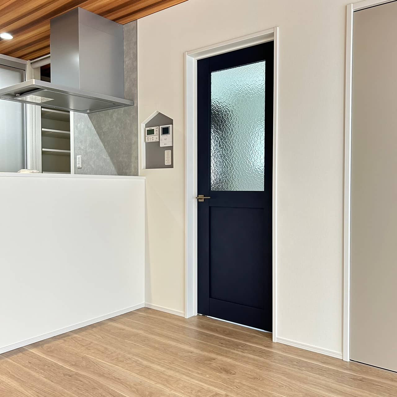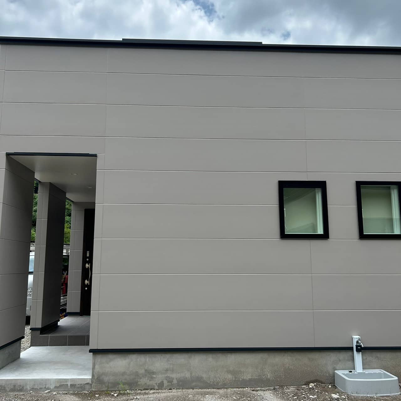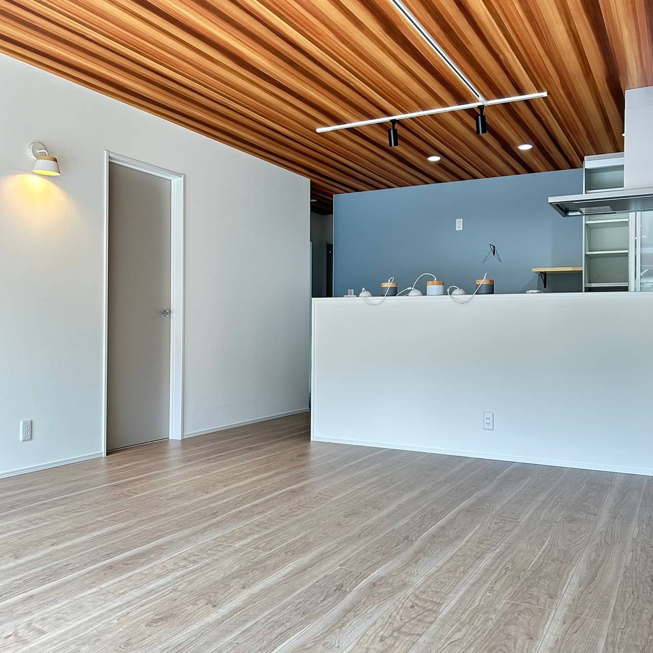 グレーの外観が印象的なモダンな平屋建てが完成しました。各スペースにはアクセントクロスを用いており個性の光る空間になりました。収納の多い対面キッチンはリビングを見渡せるので家族のコミュニケーションがいちだんとスムーズにとることができます。