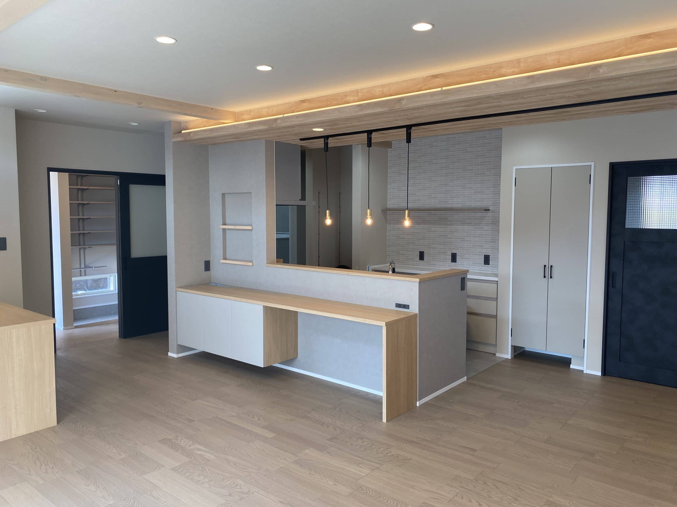 閑静な住宅地内に閑静したN様邸はシックな佇まいの2階建のお家です。明るいナチュラルテイストのリビングは家族が自然と集いたくなるような憩いの空間になりました。 各スペースでクロスを上手く使い分けることで各部屋が特徴的な仕上がりになりました。