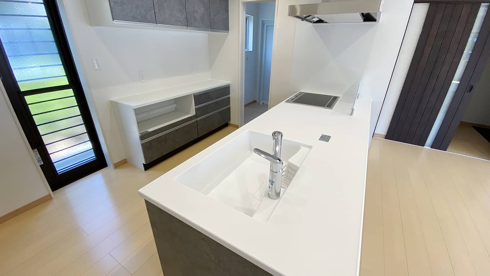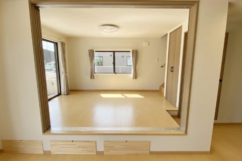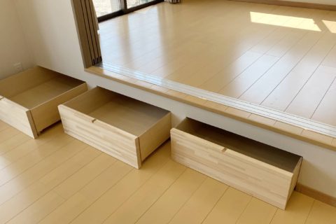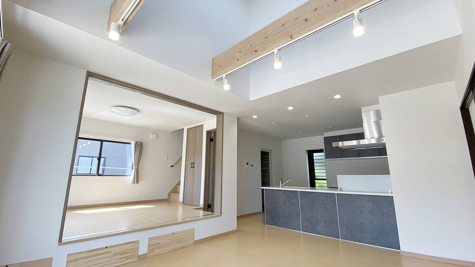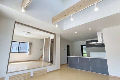 グレーの外観がシックで落ち着いた雰囲気のH様邸。吹き抜けのリビングは小上がりの洋室でゾーニングされています。小上がりの段差を利用した大容量の収納も確保してあります。奥行きを広めにとったキッチンは使い勝手が良く収納性にも優れています。