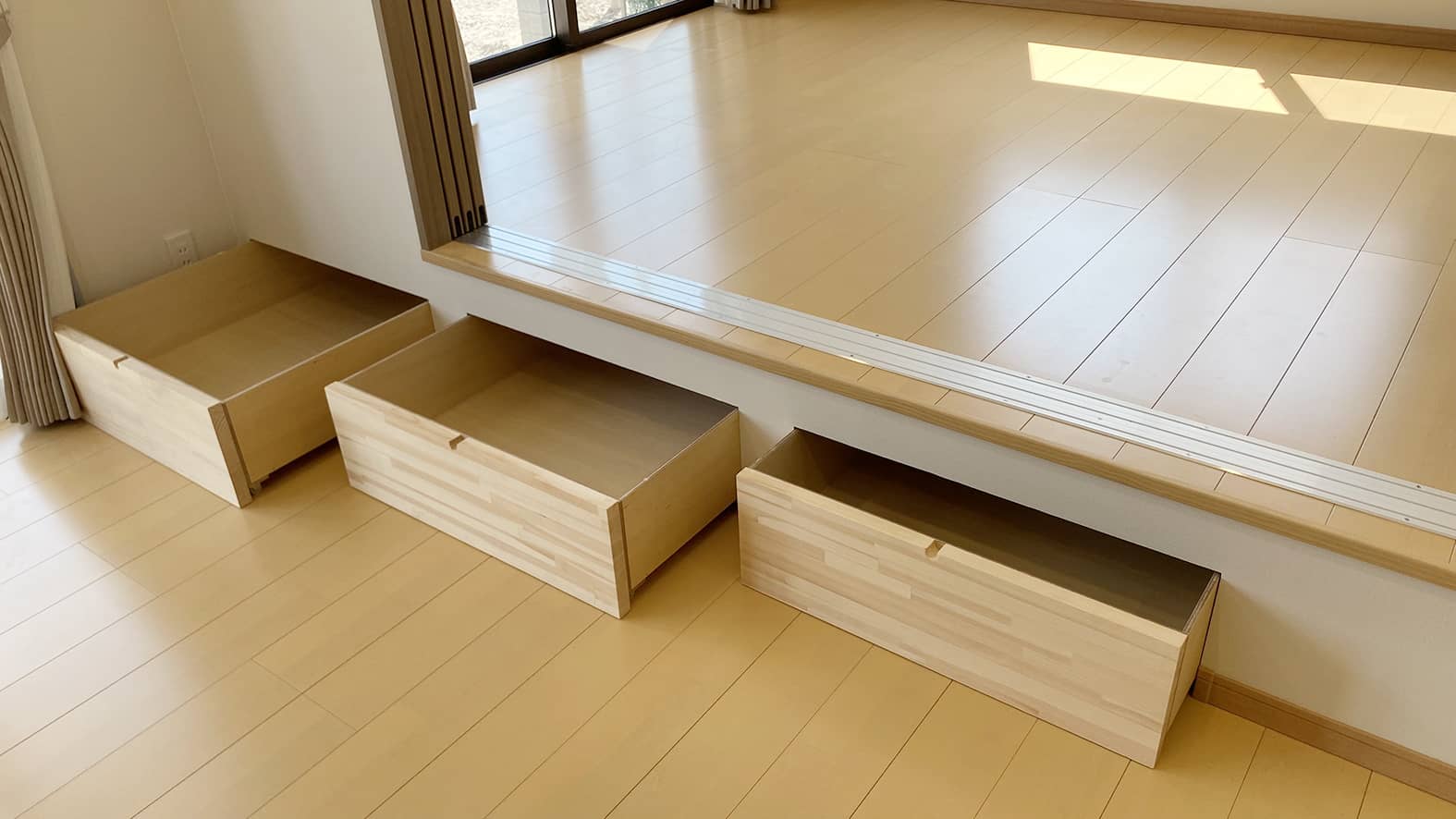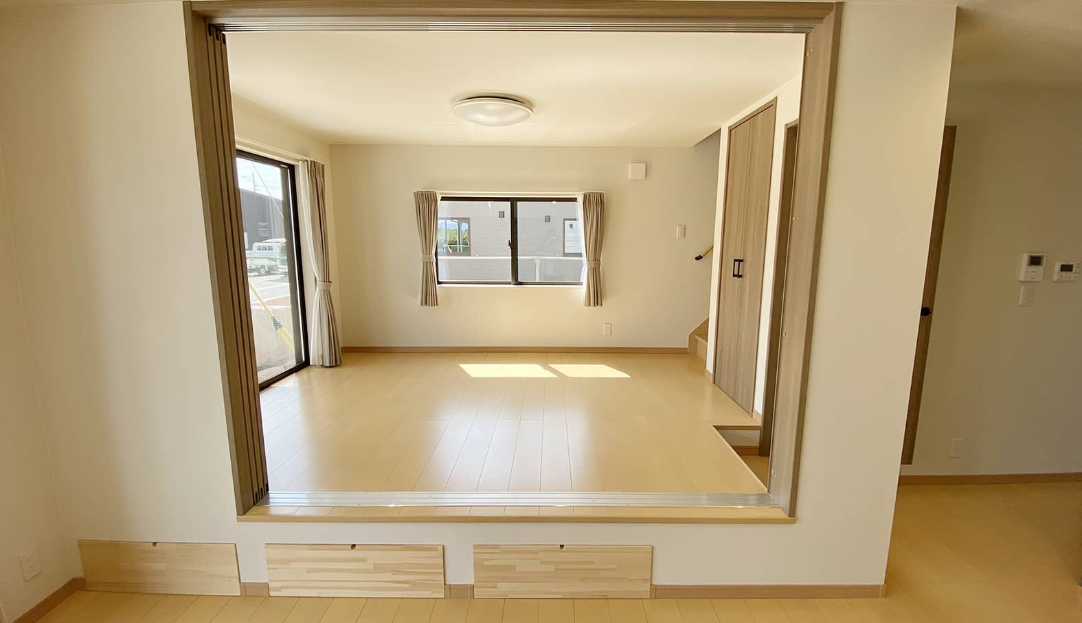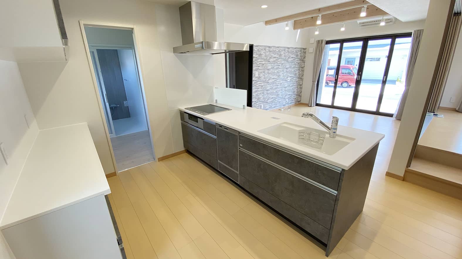 グレーの外観がシックで落ち着いた雰囲気のH様邸。吹き抜けのリビングは小上がりの洋室でゾーニングされています。小上がりの段差を利用した大容量の収納も確保してあります。奥行きを広めにとったキッチンは使い勝手が良く収納性にも優れています。