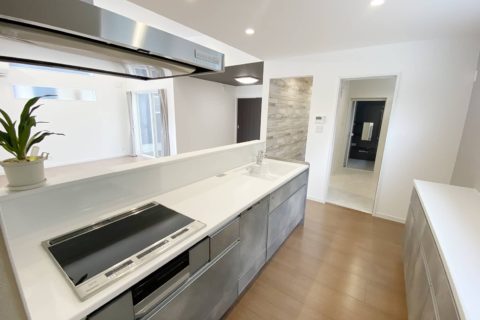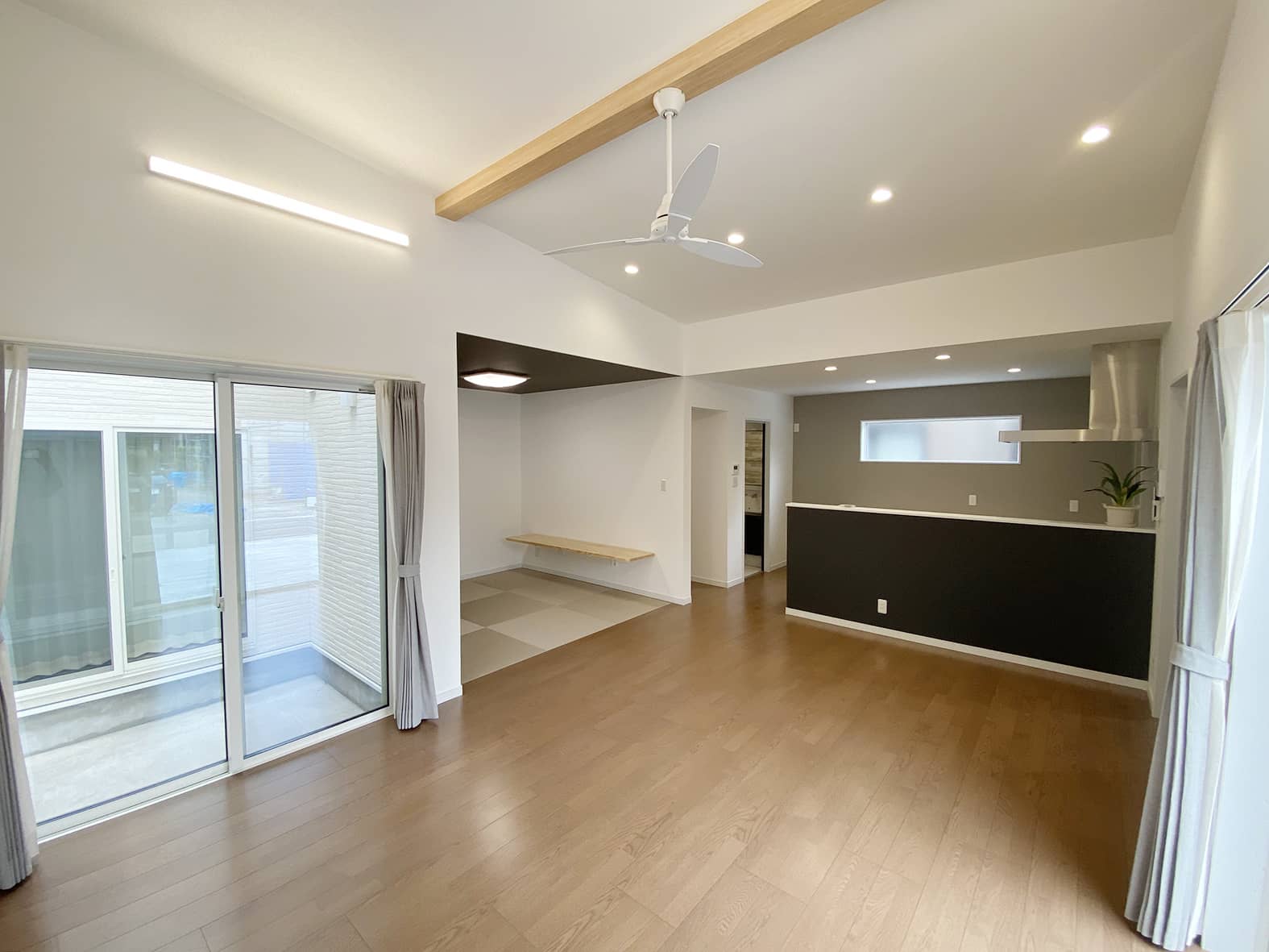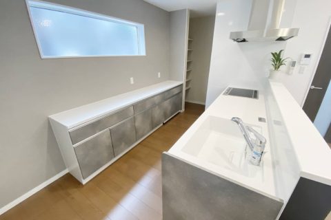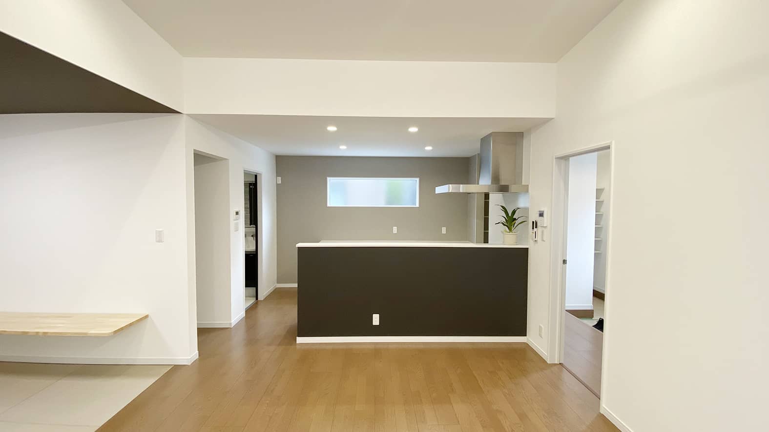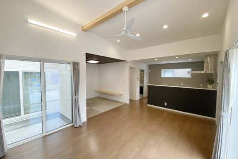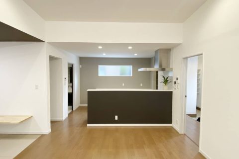 各居室へはリビングを通って移動する設計にしたことで家に帰ったらまず家族と顔を合わせることができます。リビングの天井高を高くとってあるので明るく開放的な空間で家族とのコミュニケーショが育まれます。縦方向への移動のない平屋住宅なのでどの部屋への移動もストレスなく行えます。キッチン、洗面室、浴室の水まわりを直線で配置してあるので毎日の家事がさらにラクになります。