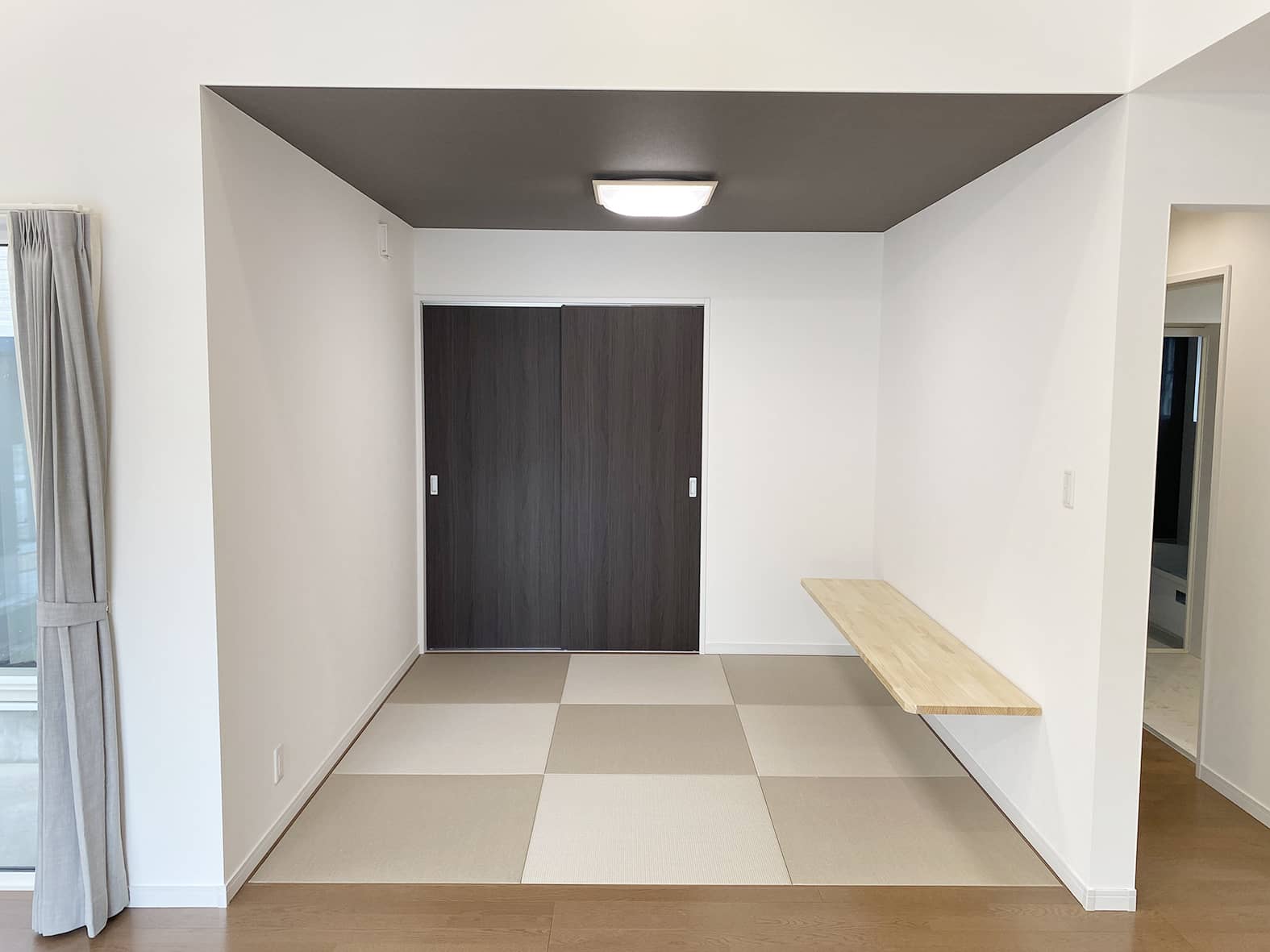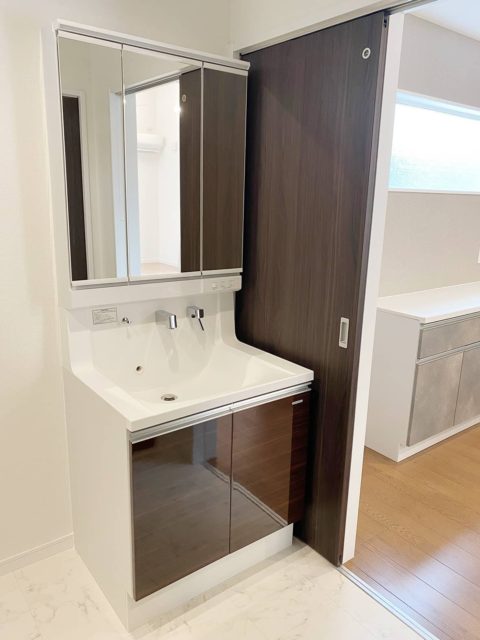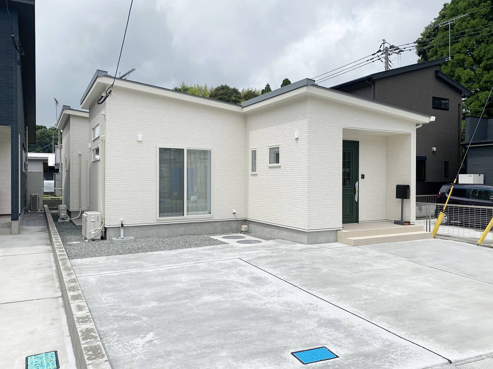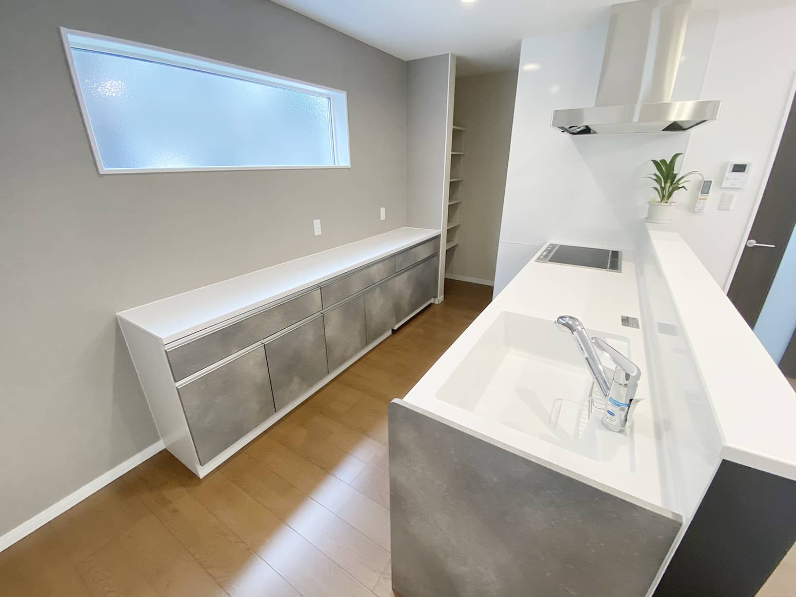 各居室へはリビングを通って移動する設計にしたことで家に帰ったらまず家族と顔を合わせることができます。リビングの天井高を高くとってあるので明るく開放的な空間で家族とのコミュニケーショが育まれます。縦方向への移動のない平屋住宅なのでどの部屋への移動もストレスなく行えます。キッチン、洗面室、浴室の水まわりを直線で配置してあるので毎日の家事がさらにラクになります。
