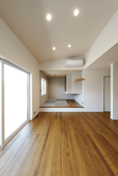家族みんながゆったりくつろげる22.5帖の大空間LDK。大きな軒のある東の窓から光を取り込み、勾配天井が開放的な空間です。
