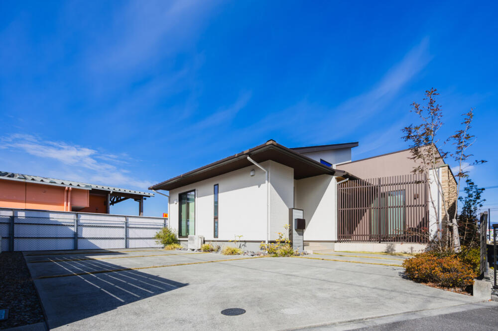 テラスの格子と、白・ブラウンを使い分けた平屋。