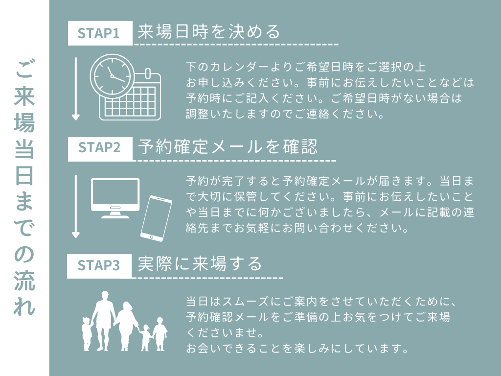 平日の見学をご希望の場合は、スタッフが常駐しておりませんので、必ず事前にご予約の上、ご来場いただきますようお願いいたします。