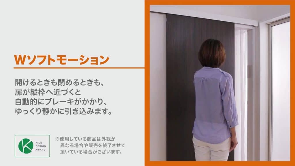 扉が閉まるときに自動的にブレーキがかかり、ゆっくり閉まるソフトモーション機能。 指をはさみにくくするだけでなく、閉め忘れ防止、開閉時の衝撃音の軽減などの効果もあります。