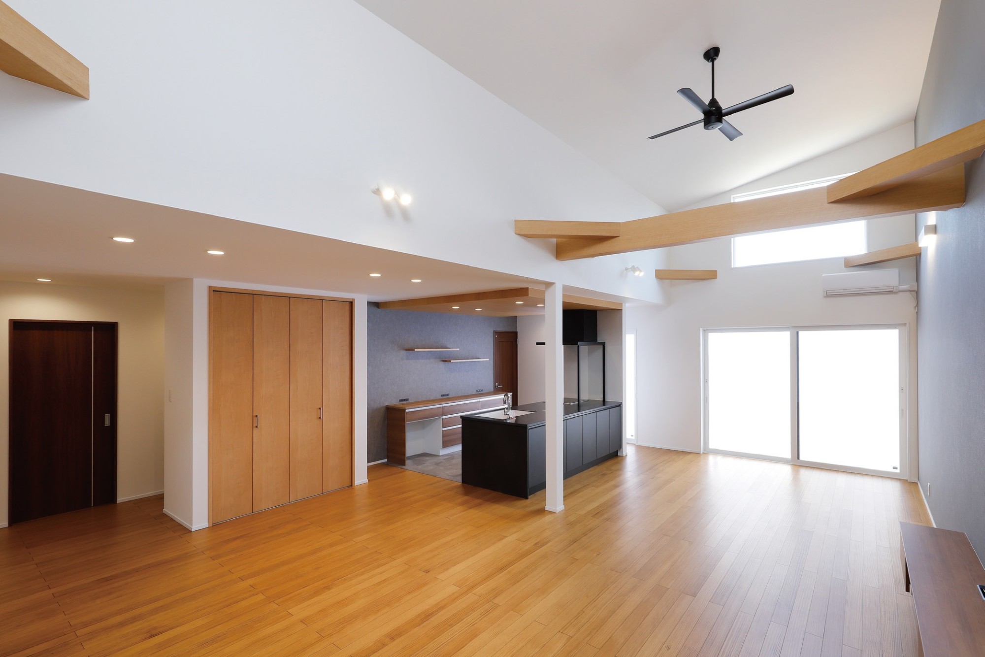 家族が集まるLDKは30.7帖と圧巻の広さ。リビングダイニングの吹き抜けに現し梁でアクセントを付けて、大空間にメリハリもプラスしました。