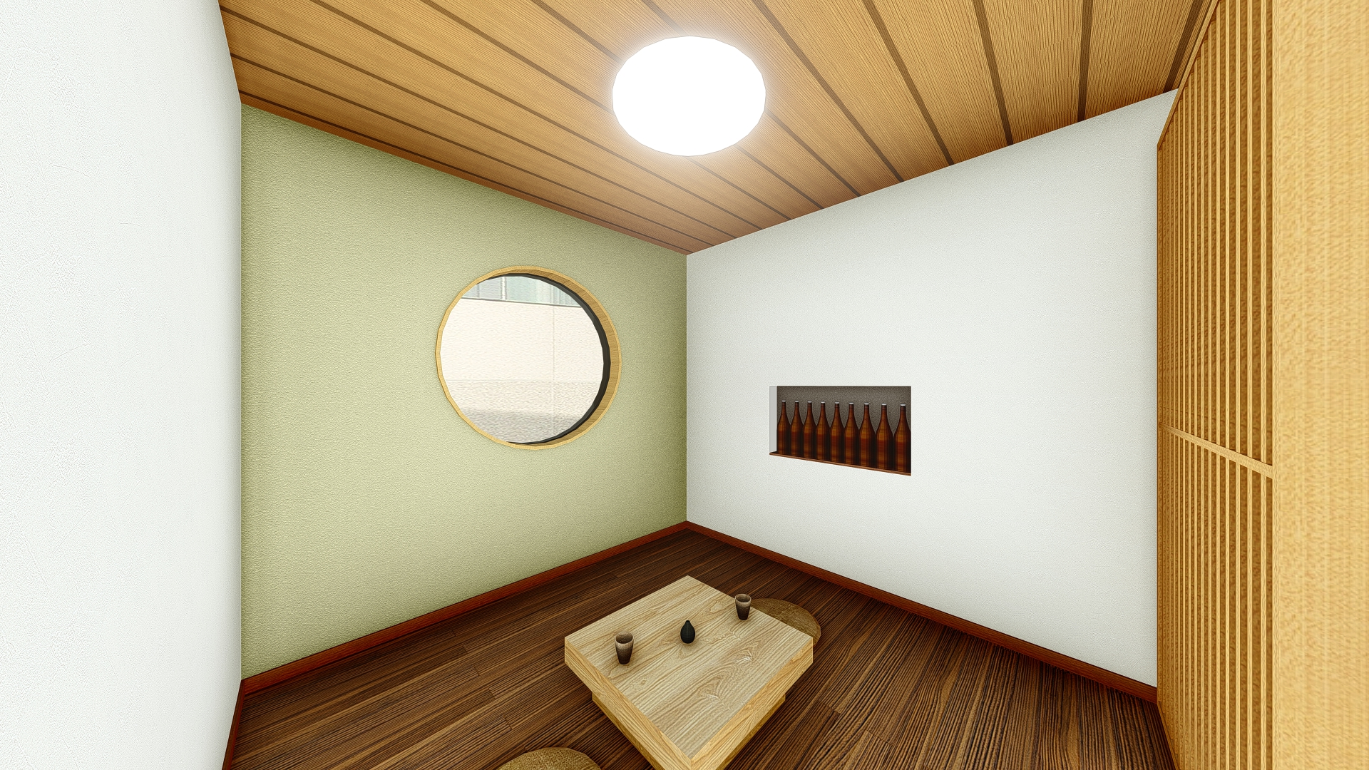 LDKとの境目を木格子でさりげなく仕切った和テイストの洋間。焼酎をディスプレイするニッチと和モダンな丸窓が、くつろぎの雰囲気を高めてくれます。