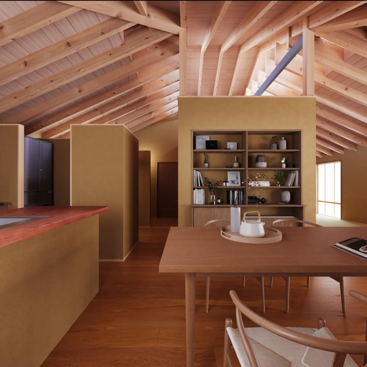力強い構造の現れた天井と、素朴な塗壁との空間