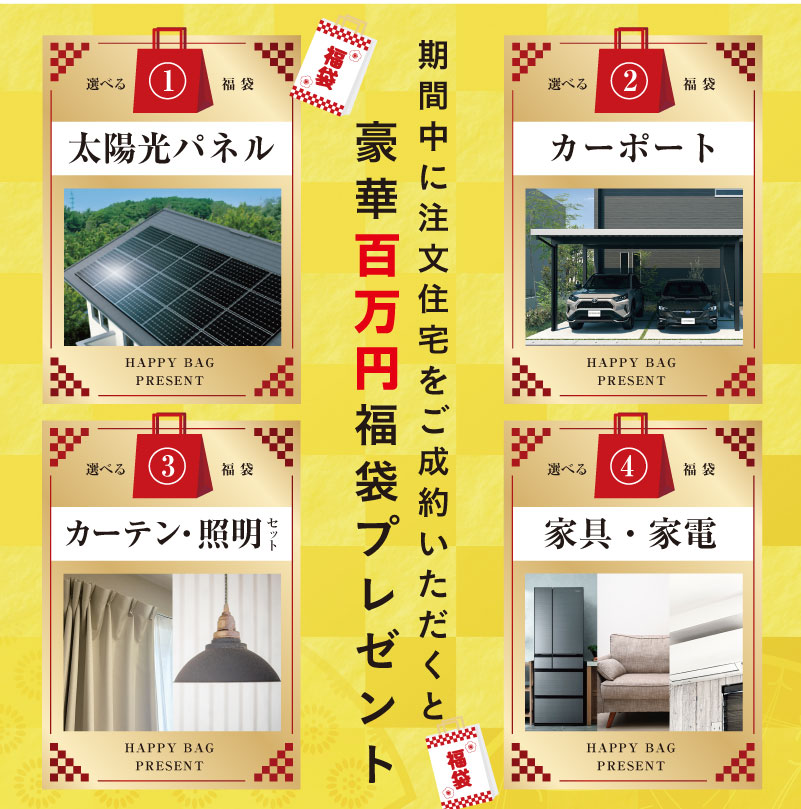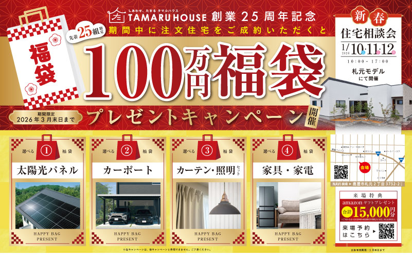 創業25周年の感謝を込めて、田丸ハウスから新春だけの特別企画。期間中に注文住宅をご成約いただいた先着25組様へ「選べる100万円分の福袋」をプレゼントします。太陽光パネル、カーポート、カーテン・照明、家具・家電暮らしを一気にアップデートできる4つの福袋からお好みでお選びいただけます。1/10・11・12は札元モデルにて新春住宅相談会を開催。家づくりの疑問や資金計画、土地のことまで、気軽にご相談ください。このチャンスは期間限定(〜2026年3月末)。新しい一年、理想の住まいを賢くはじめませんか。