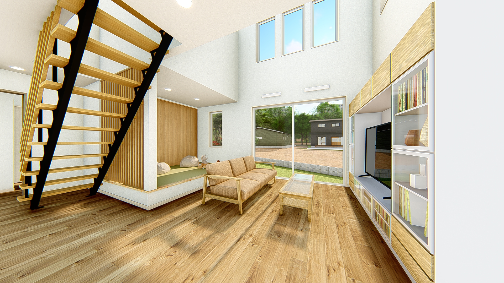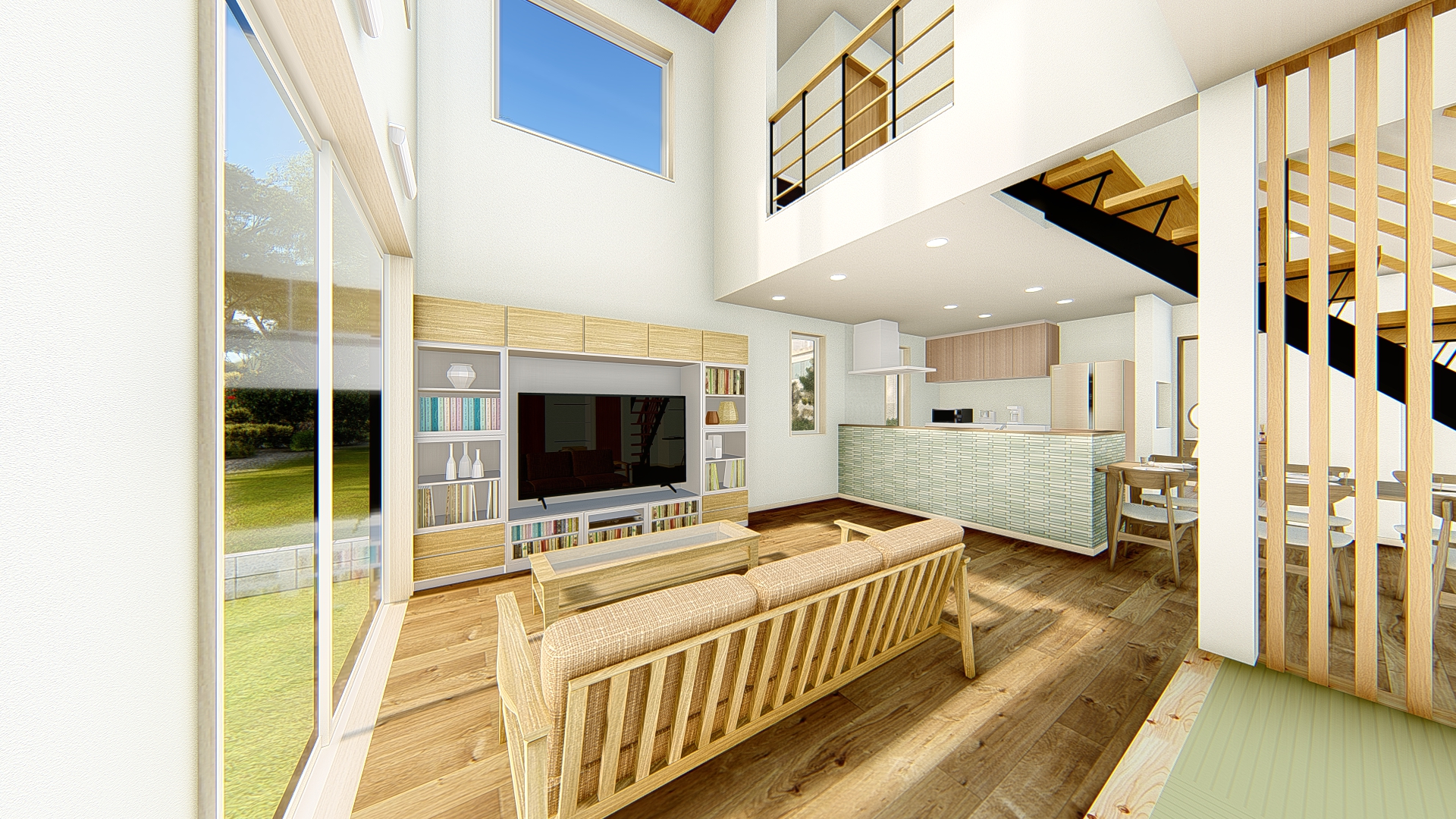 小上がりの和室と一体に使えるリビングは、大きな吹き抜けで開放感バツグン。2階の廊下にもつながっているから、家族の気配を常に感じながら過ごすことができます。