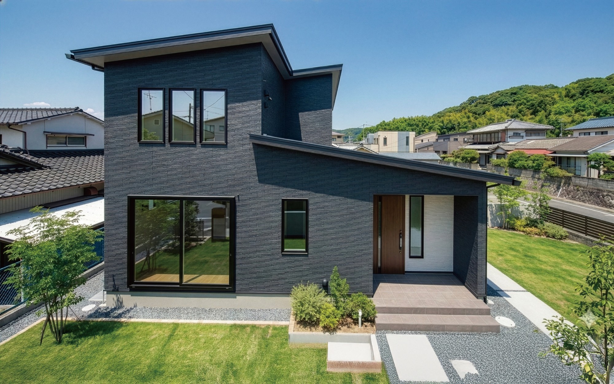 1階と2階で勾配の異なる屋根をバランスよく組み合わせたスタイリッシュな外観。南側の屋根には7.20kWの太陽光パネルを搭載。光熱費負担を軽減しながら、環境にも配慮した省エネ住宅です。