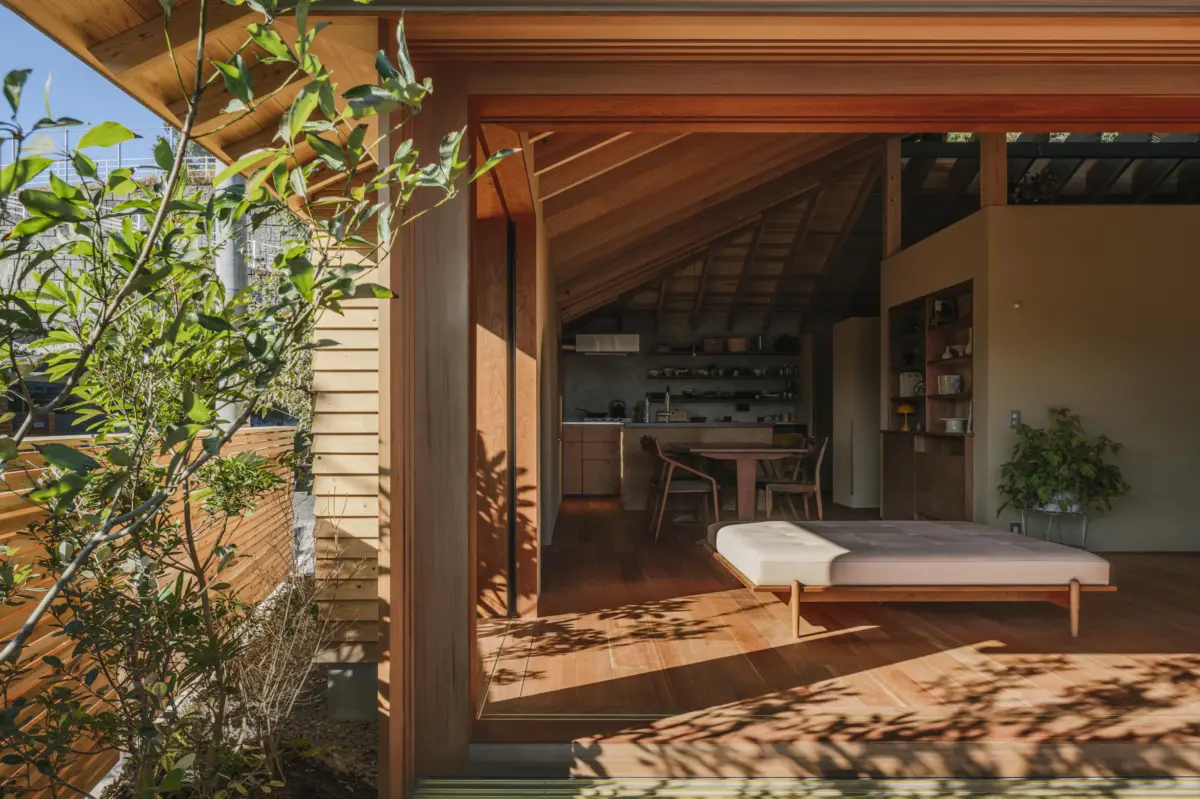 「入母屋」の屋根は、空からの光と遠くの山並みを切り取り柔らかい光が差し込みます