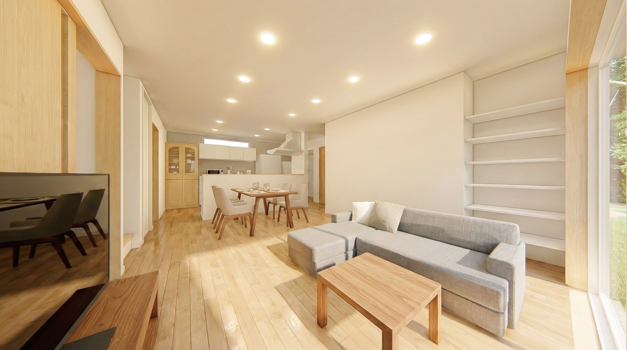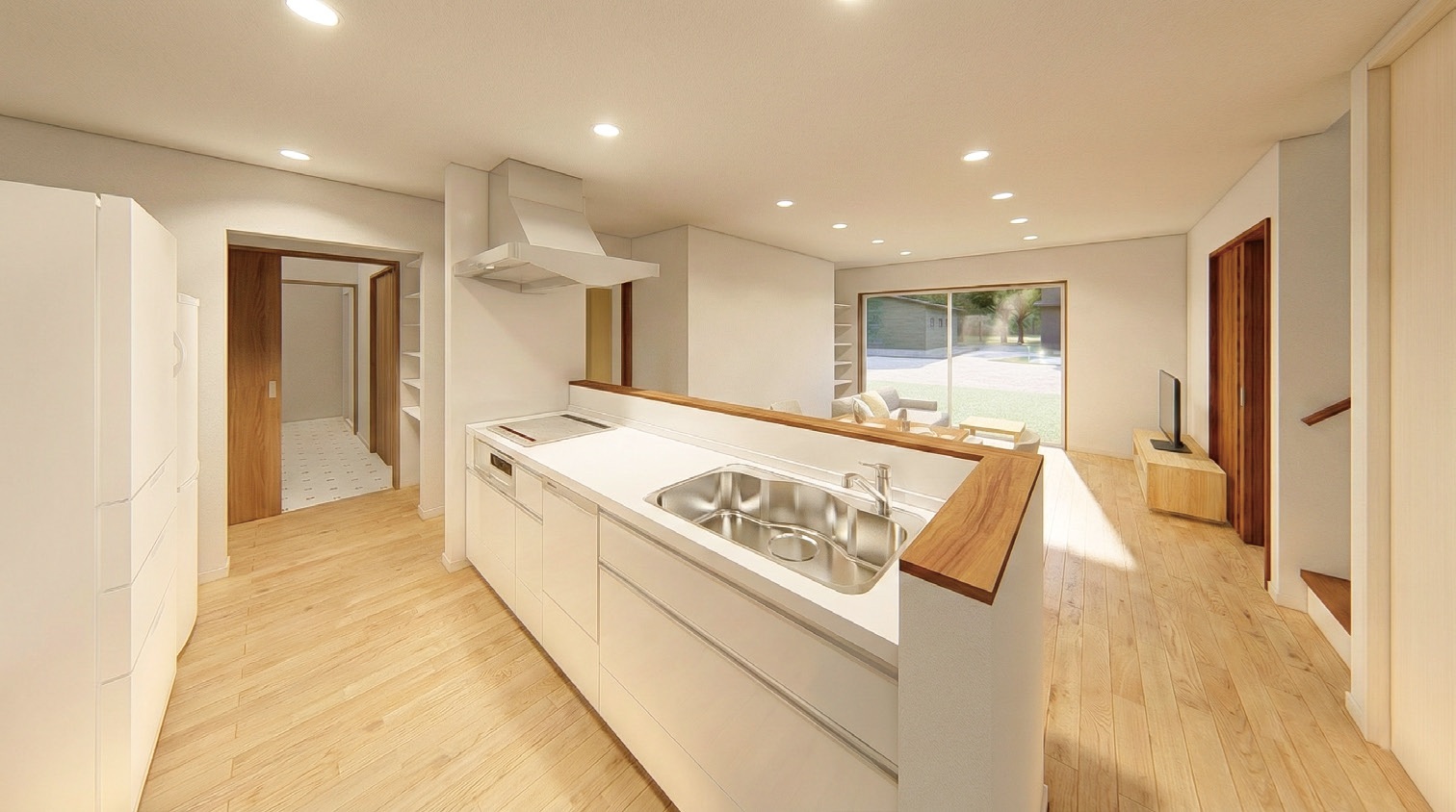 キッチン・ダイニング・リビングが一直線に並んだLDKは、二世帯一緒に家族団欒の時間を楽しめるスペース。南向きの窓からリビングへ光と風も取り込みます。