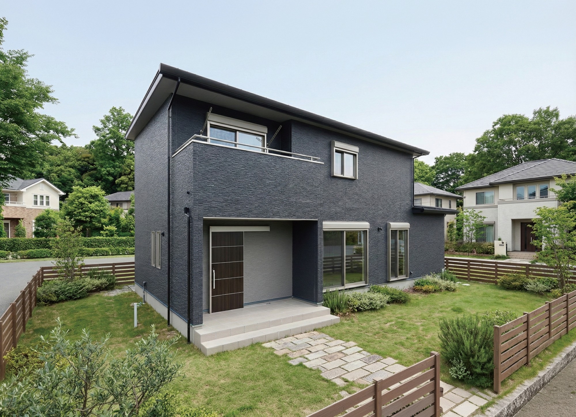 シックなカラーで引き締めたスタイリッシュな二世帯住宅。南向きの屋根には5.76kWの太陽光パネルを搭載。家計にも環境にも優しい長期優良住宅で、三世代が長く安心して暮らせるようにしました。