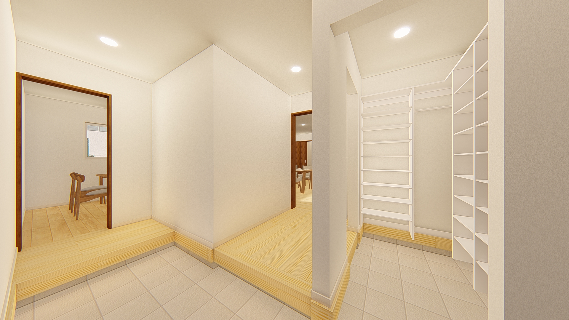 収納を通過する家族用動線とLDKに直行する来客用動線に加えて、セカンドダイニングへつながる3WAY動線を備えた玄関。奥行きがある、ゆとりの空間です。