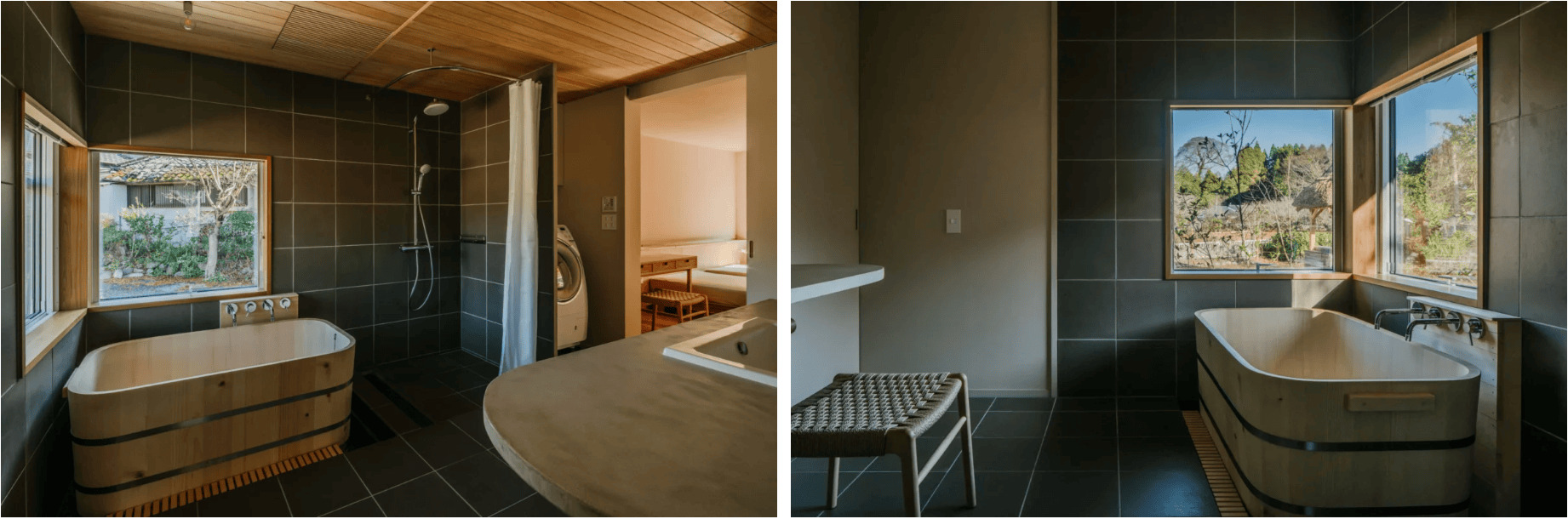 ・オーナーこだわりの檜の浴槽を置いたオリジナル浴室スペース